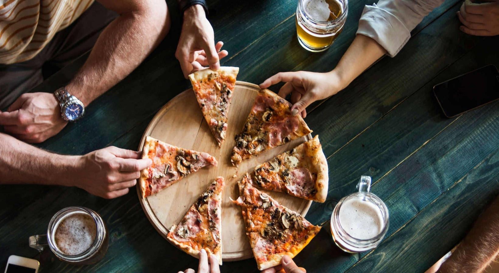 • a group of people eating pizza