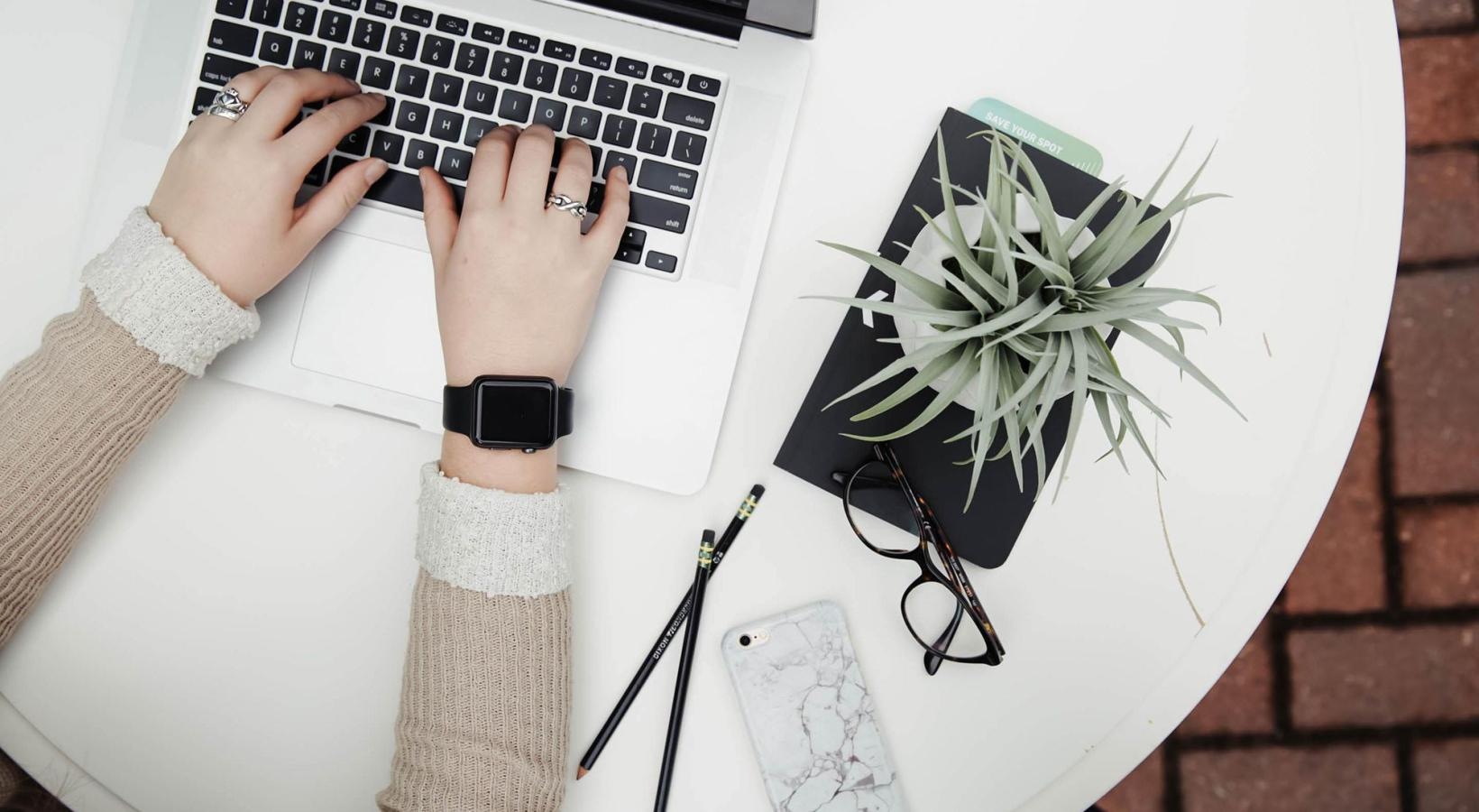 • overhead shot of woman working on a laptop at a round table with pencils, her cell phone, glasses, notebook and a potted plant