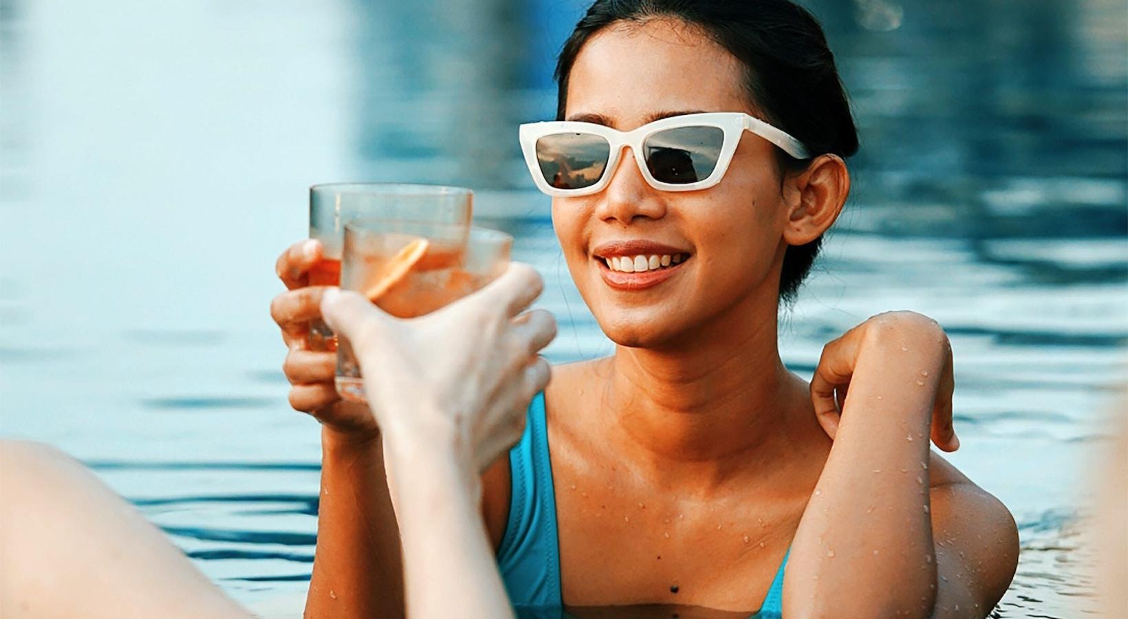 • a woman in a pool holding a drink and a glass